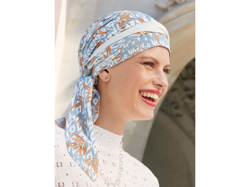 Šátek - Turban Beatrice se nasazuje jako čepice. Je navržený a ušitý z přírodního materiálu, velmi pohodlného a luxusně měkkého bambusového vlákna. Šátky jsou na omak měkké a mohou absorbovat a zároveň odvádět až čtyřikrát více vlhkosti než bavlna, aniž by vznikal pocit vlhka. Navíc dobře odolávají bakteriím. Bambusové vlákno má termoregulační vlastnosti a prodyšnost, takže vyrovnává teplo, nebo v teple ochlazuje a chladném počasí ohřívá.