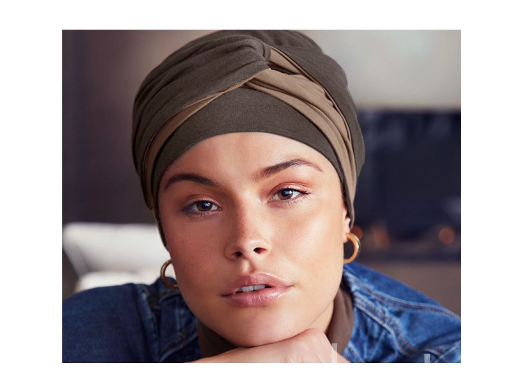 Šátek - Turban Ella - nasazuje se jako čepice, bandáž lze nosit zvlášť nebo vcelku. Obsahuje 1ks turban a 1ks bandáž.